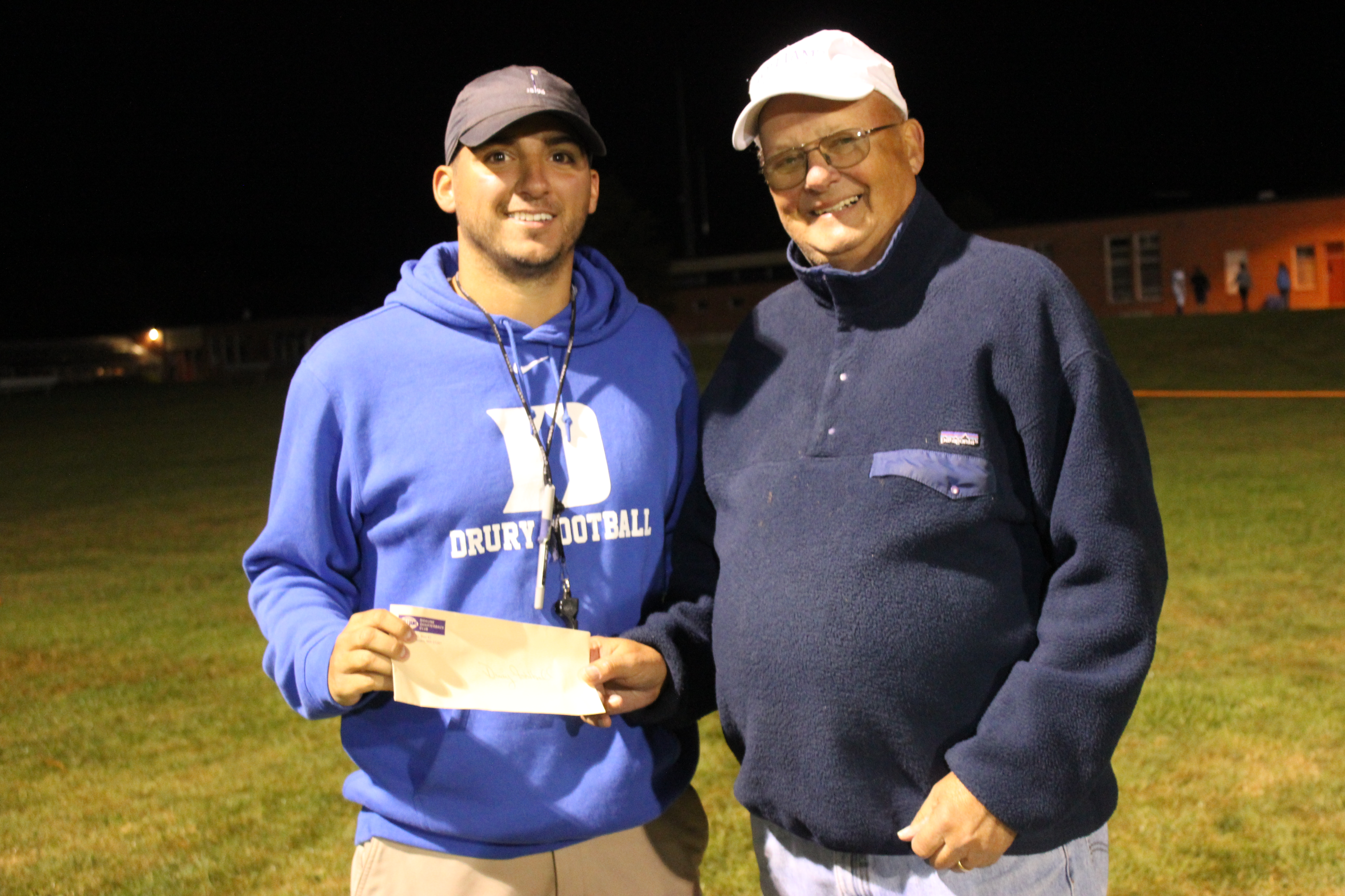 The Williams Sideline Quarterback Club is proud to support two area high school football programs. Mt. Greylock and Drury High Schools each have new coaches this year, and we are happy to help them build their programs. Secretary, Bill Judge presented each of the coaches with a donation on September 26, 2015 after their game.